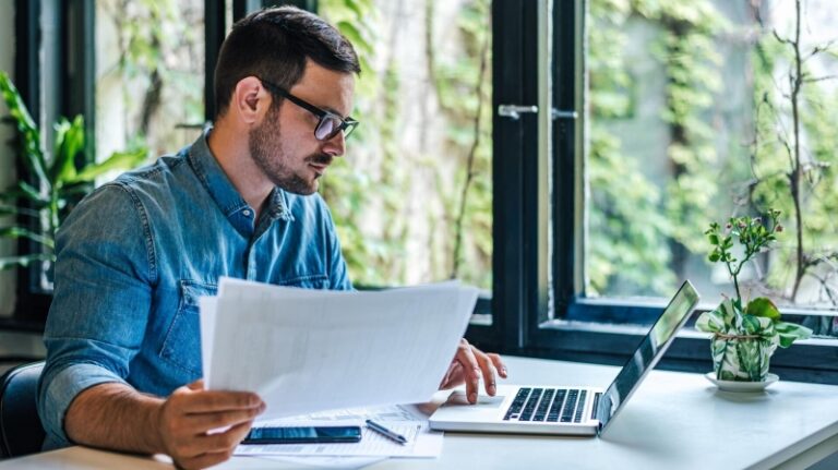 Мужчина с документами за компьютером. Архивное фото