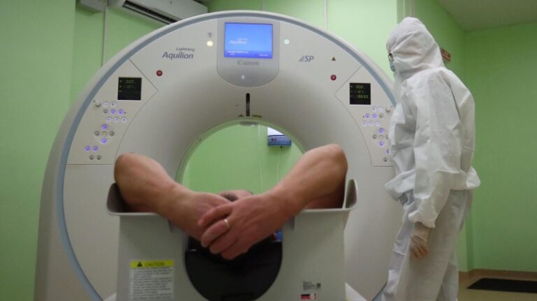 Медицинский сотрудник готовит пациента к проведению компьютерной томографии . Архивное фото
