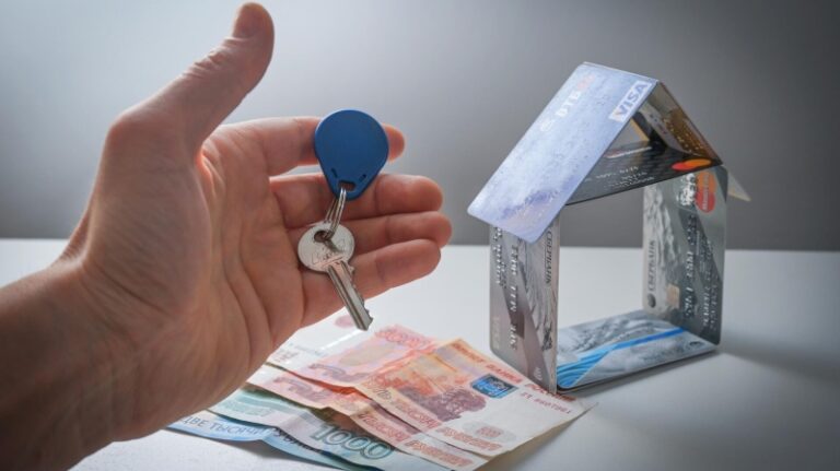 Ключ, деньги и домик, сложенный из банковских карт. Архивное фото