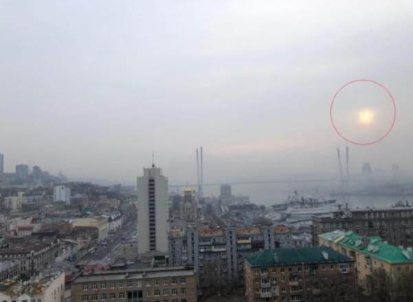 Загадочное небесное явление зафиксировано местным жителем в небе над Владивостоком. Надо сказать, в этот день стоит аномально тёплая для зимы плюсовая температура, город окутал плотный туман.