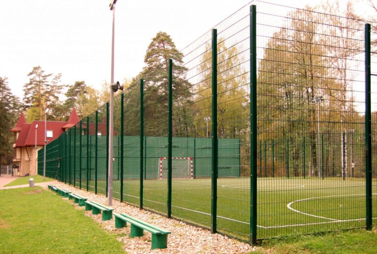 Ограждения для спортивных площадок из сетки-рабицы очень распространенные, потому что дешевы. Такие металлические ограждения для спортивных площадок используют, когда выделяется небольшой бюджет. Ими можно огораживать футбольные поля и другие крупные территории.