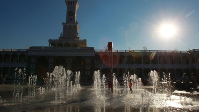 Дети купаются в фонтанах возле Северного речного вокзала. Архивное фото