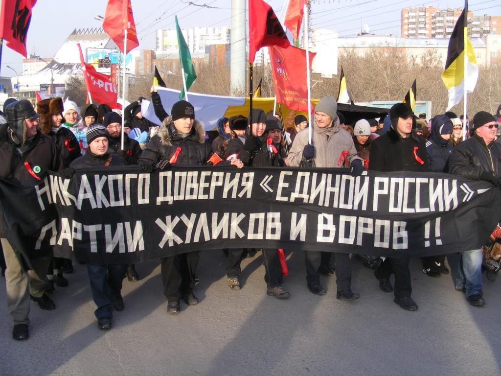 Пользователь Twitter Денис Стяжкин также пишет, что собравшиеся выкрикивают лозунг «Россия без Путина!», который обычно можно слышать на митингах либеральной оппозиции. Звучат лозунги: «Россия это Европа!», «Русский проснись — русский борись!», «Путин и Медведев — убирайтесь вон!»