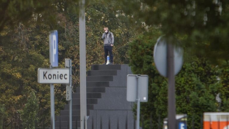 Мужчина, который угрожал взорвать себя, стоит на памятнике на площади Пилсудского в Варшаве